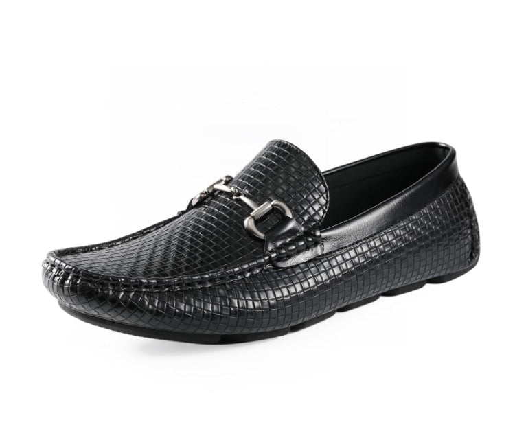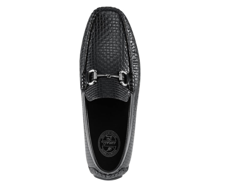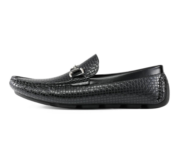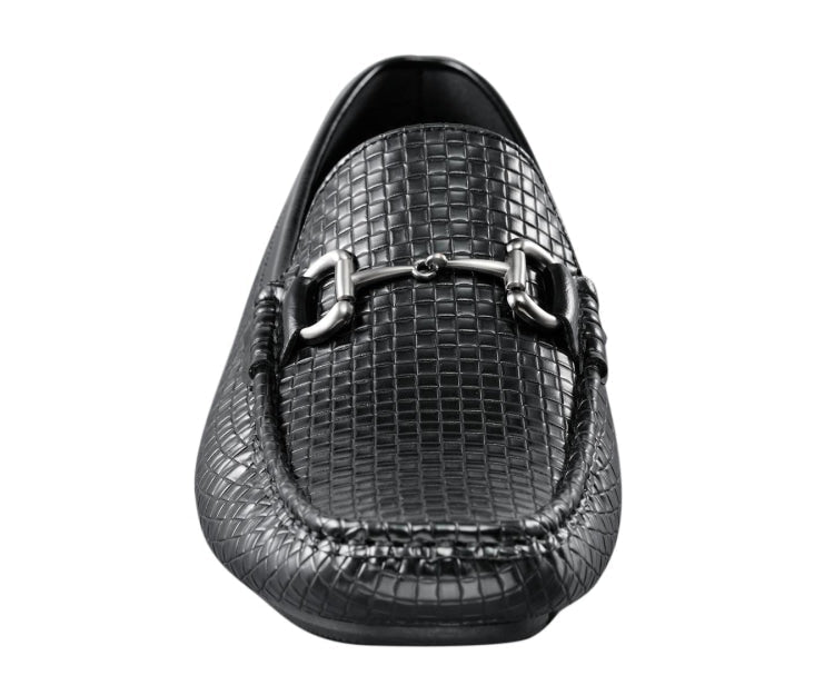 Discover the perfect combination of elegance and modern sophistication with Amerigo black horsebit loafers by Amali. Crafted from premium synthetic leather with a classic moccasin silhouette, these refined mens woven loafers are the epitome of versatility and style. The unique woven texture adds a touch of flair, making them a standout piece in any wardrobe.