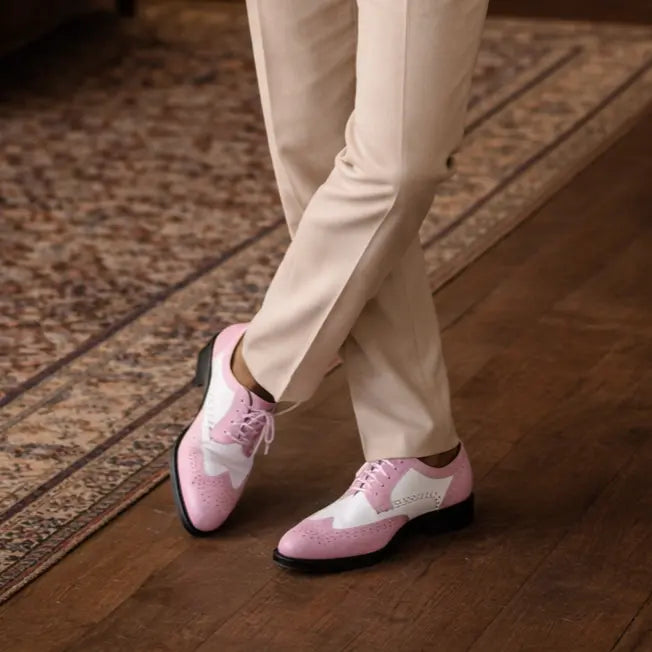 Make a bold statement with the Elwyn Pink and White Dress Shoes – the ultimate choice for men seeking pink and white dress shoes. These Bolano-designed men's spectator shoes feature intricate brogue detailing and a striking two-tone design for a refined yet eye-catching look.