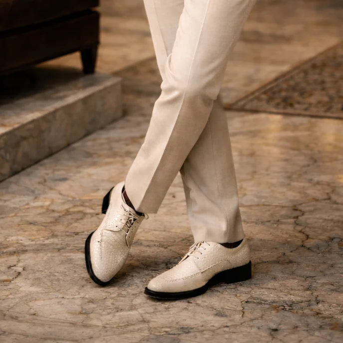 Make an impression in cream dress shoes with the Harvey Cream Dress Shoes by Amali, a perfect blend of classic elegance and modern design. These men's crocodile dress shoes feature a sleek croco print and a secure lace-up closure for a refined yet versatile look.