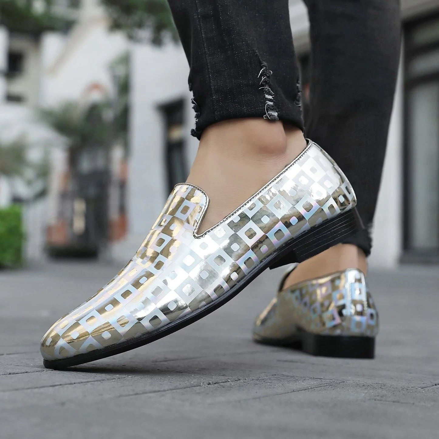 Unveiling Amali’s Kodiak, a spectacle in men's fashion dress shoes that demands attention. These are not your ordinary men's slip on loafer; they are a celebration of individuality and style. With a holographic gleam and a checkered pattern that catches the light with every step, Kodiak men's fashion dress shoes are designed to make a statement. Show them off on your next night out in the city. Claim your pair of Kodiak men's slip on loafer now and ignite a spark of brilliance in your every day!
