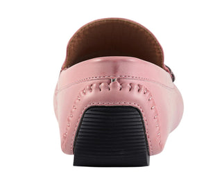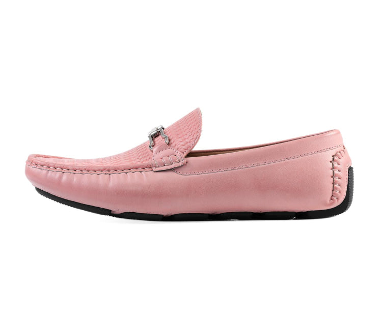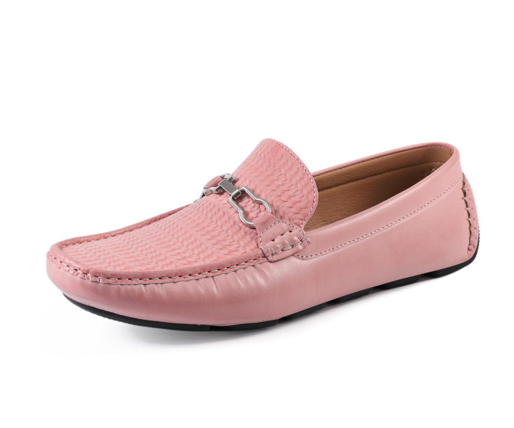 Make a stylish statement in pink driving moccasins with the Charles Pink Driving Moccasins by Amali, a perfect fusion of fashion and function. These mens driving moccasins feature a textured upper and a sleek silver double bar ornament for ultimate sophistication.