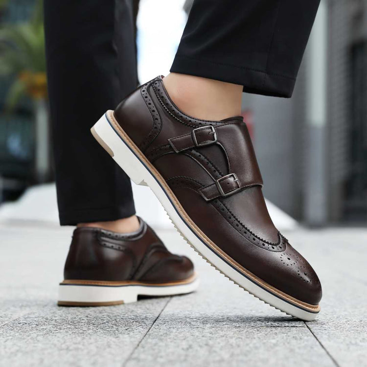 Get the best of both style and comfort with the Dario brown monk strap shoes. They feature brogue detailing, a soft cushioned insole, and a durable rubber sole to ensure ultimate functionality. Slip them on effortlessly and enjoy a versatile design that lets you look sharp all day long.