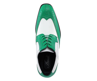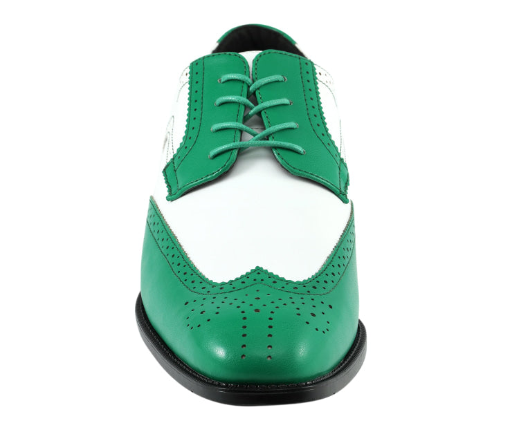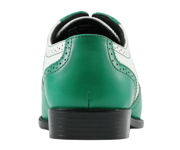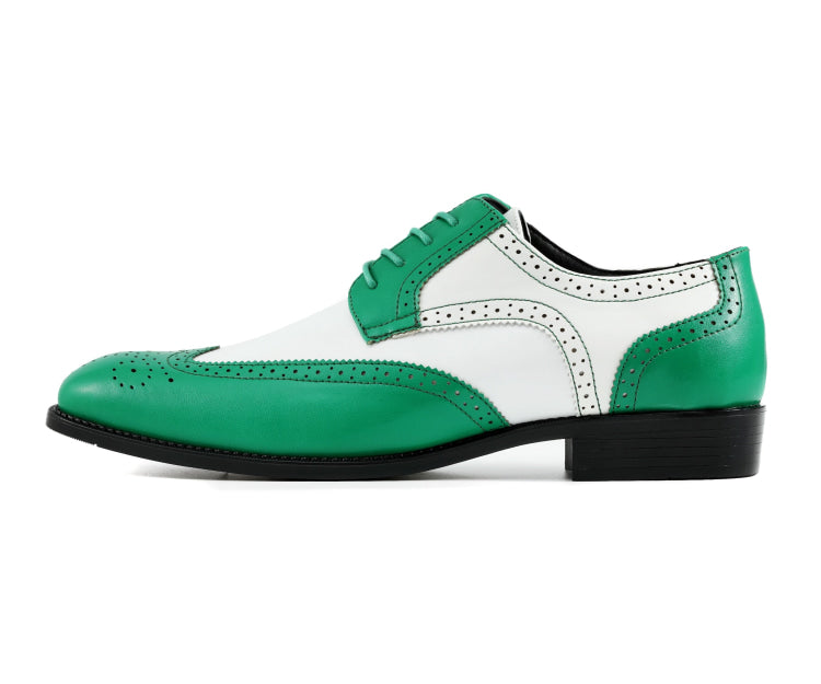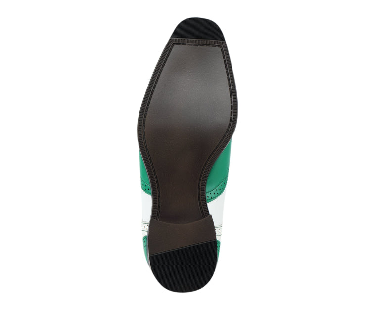 Take a daring step with the Elwyn Green and White Dress Shoes - the ultimate pick for men seeking green and white dress shoes. These Bolano-designed men's spectator shoes showcase intricate brogue detailing and a striking two-tone design for a refined appearance.