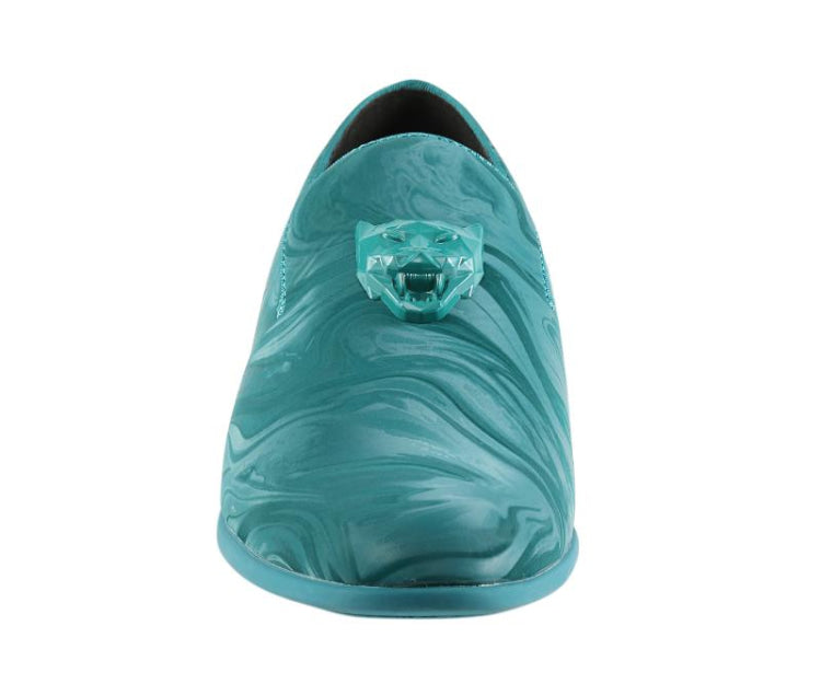 Take a risk in turquoise smoking slippers with the Jano Turquoise Smoking Slippers by Amali! These mens tuxedo slippers elevate any daring look. Featuring a unique swirling synthetic finish, a sleek slip-on style, and a fierce lion detail, these formal slippers are a bold statement piece.