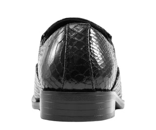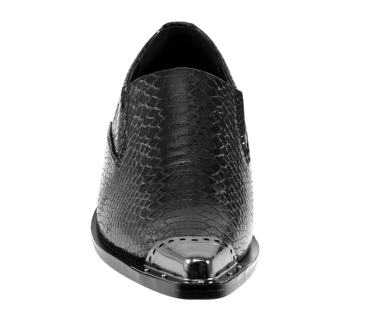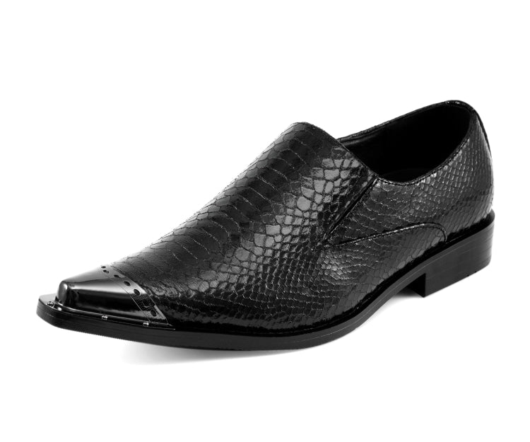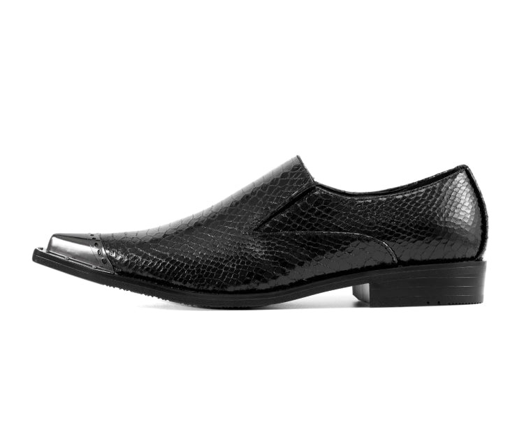 Make a bold impression with the Norman Back Pointed Loafers, a striking pair of black pointed loafers that combine design and sophistication. These mens metal tip dress shoes feature a textured faux snakeskin upper and polished metal accents, delivering a high-fashion look.