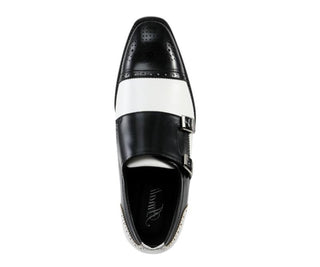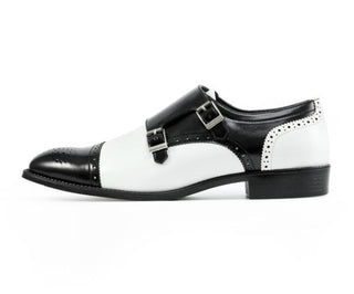 Make a bold impression in white and black monk strap shoes with the Winston White and Black Monk Strap Shoes by Amali. These men's double monk strap shoes showcase a striking two-tone design, intricate perforations, and dual adjustable buckles for a sleek, polished finish.